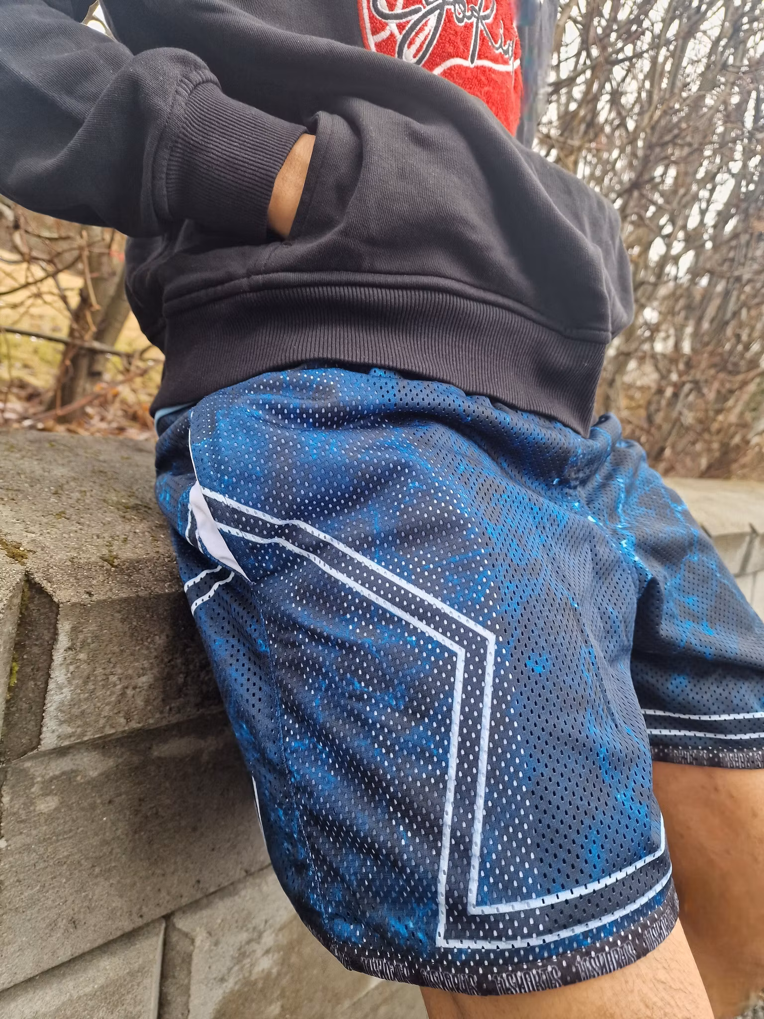 Myk treningsshorts med lommer. Shortsen er laget i lett polyester med små hull, som gjør at den puster og ikke blir klam. Passformen er romslig og kort. Det anbefales å gå opp en til to størrelser dersom man vil ha en romsligere passform. En XL kan sammenlignes med en normal M om man vil ha shortsen litt lengre og løsere rundt midjen.