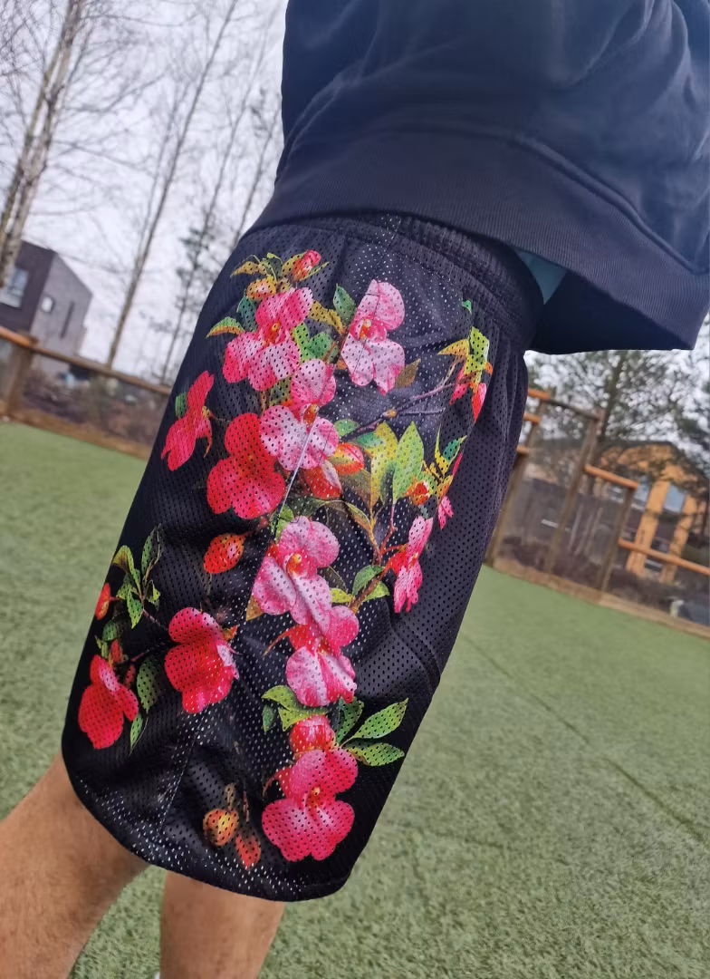 Myk treningsshorts med lommer. Shortsen er laget i lett polyester med små hull, som gjør at den puster og ikke blir klam. Passformen er romslig og kort. Det anbefales å gå opp en til to størrelser dersom man vil ha en romsligere passform. En XL kan sammenlignes med en normal M om man vil ha shortsen litt lengre og løsere rundt midjen.